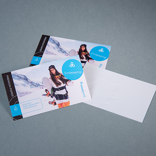 This finish is produced by pressing a metal die from the back of the card to produce a raised (embossed) effect on the front. This means that a negative debossed effect will remain on the back, so design with caution.