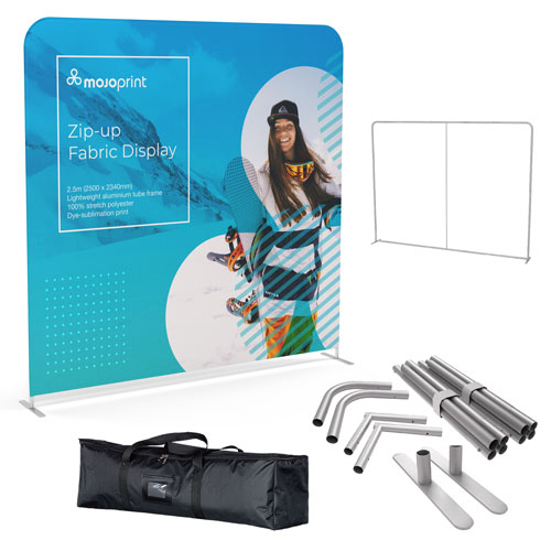 Cost-effective backdrop display for events and trade shows. The lightweight frame clicks together easily and can be installed in just a few minutes. Pull the fabric over the top and zip-up at the bottom to pull it tight. Carry bag included. Printed full color both sides as standard. Replacement frames and graphics available.