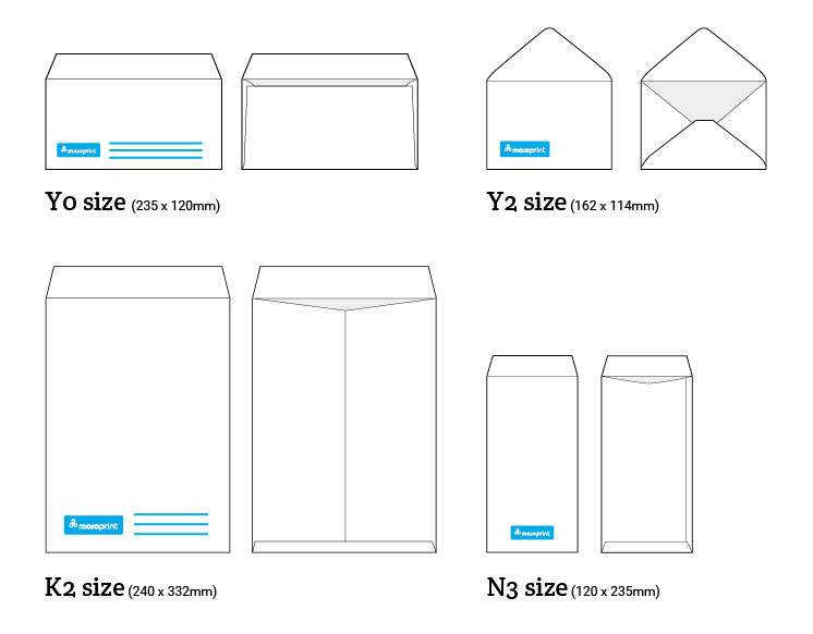 Y2 size fits A6 size postcards or flyers. N3 size (opens on the short side) and Y0 size (opens on the long side) are both suitable for A4 sheets folded into thirds. K2 size is suitable to fit unfolded A4 documents. The N3 size envelope is printed on 80g kent stock, while the other 3 kinds are on 100g kent stock.