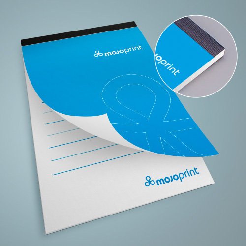Custom notepads for your brand or business, reinforced on the glued edge with a cloth tape, and with a sturdy grey card backing.