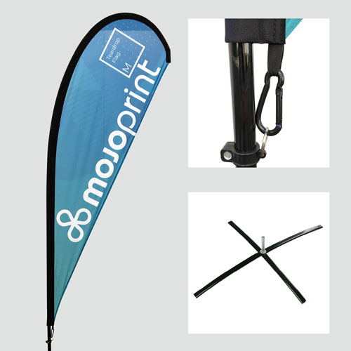 Set consists of custom flag (single side print or double sided 2-ply print), durable aluminium/fiberglass pole, cross base and water bag*, and carry bag.